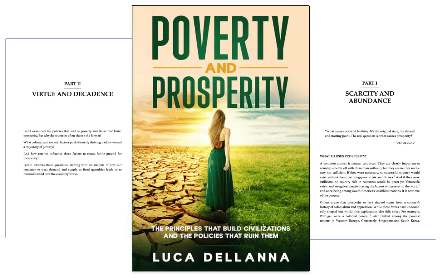 About the bookA friend recently asked me what brought me to write it. My answer: frustration. "Frustration with what?," you might ask. The introduction of the book, copied below, answers this question. The introduction of Poverty and Prosperity"'Productive societies redistribute prosperity; We live in an age of unprecedented wealth, yet our prosperity hangs by a thread. I watch with growing concern as some of our politicians erode its foundations. Even worse, they do so with impunity: most journalists do not call them out, nor do most voters, who, after all, elected them. Why? Because we take prosperity for granted. But history teaches us that prosperity is not the norm; poverty is, and we are always a few bad decisions away from regressing into it. Consider Venezuela: once the wealthiest country in South America, it is now the poorest. We have lost track of how we arrived at our current position and what it takes to maintain it. Instead of celebrating those who create prosperity, we elect those who redistribute it, until only crumbs remain. We optimize the present while neglecting to build the future. I wrote this book as both a warning and a guide. For readers in wealthy countries, it is a wake-up call: here are the policy mistakes that can undo decades of progress, and here is how to spot them before it is too late. For those in developing nations, it serves as a roadmap to prosperity, illustrating which strategies are effective and which are not. Most importantly, it provides everyone with the tools to advocate for better policies, whether at the dinner table or the voting booth. The goal is to help build countries that are wealthier, cleaner, safer, and freer. Book overviewThis book comprises three parts and twenty-six chapters. The Prologue examines a recent environmental preservation project in Great Britain to explain why the efficiency of public spending matters. Through the lens of two fictional countries, Moralia and Pragmatia, it shows how practical approaches to public spending often yield better results than purely moral ones. Part I, “Scarcity and Abundance,” explores the choices that lead nations to prosperity or poverty. It argues that prosperity arises from creating abundance through efficiency and accountability. A society needs surplus production to provide a decent life for all and sustain institutions that uphold fairness, health, and sustainability. We need not maximize productivity, but must keep it above a critical threshold. Productive nations share prosperity, unproductive ones share poverty. How can we, however, boost national productivity without cutting corners or exhausting ourselves? One key is letting wages signal which jobs society values most, allowing unproductive jobs to fade naturally while helping affected workers transition. Nations prosper when they treat low wages and high prices as structural issues, and decline when they rely on superficial fixes. Examining policy missteps around the world, we uncover another path to poverty: swelling opportunity costs. Nations grow poorer when they focus on the wrong priorities or spend tax money inefficiently. Instead of debating tax rates, we should concentrate on spending current tax receipts more wisely. Part I concludes with a review of principles and policies that promote prosperity and prevent poverty. But why do nations so often make poor choices that lead to decline? This question drives Part II. Part II, “Virtue and Decadence,” investigates the cultural factors behind good and bad policy decisions. Using examples from around the world, it shows how nations decline when they pursue luxuries before securing basic needs. Rushing to solve problems can mean overlooking stronger, long-term solutions. The dangers of groupthink deserve special attention, especially in identity politics, where the urge to protect "our own" can sometimes excuse poor behavior. As the saying goes, the road to hell is paved with good intentions; therefore, intentions must be subordinate to outcomes. We also examine the critical role of journalism in preserving democracy and prosperity. Nations thrive when truth circulates and falter when it is obscured. Better scientific peer review, falsifiable policies, and journalists who resist short-term political pressures are essential. While Part I offered economic solutions and Part II presented cultural ones, implementing them is not simple. It is essential to avoid becoming tyrants while we pursue prosperity. Part III, “Utopia and Dystopia,” addresses this challenge. It shows how good intentions can lead to disastrous outcomes and offers safeguards. We explore democracy's paradox: although democratic systems are superior to dictatorships, many autocracies emerged from democracies. What warning signs indicate we are sliding toward autocracy, and how can we reverse it before it is too late? We also examine the foundations of civilization and how to prevent its decline into barbarism. One key principle stands out: to preserve our rights, we must guarantee them even to our enemies. Finally, we discuss the thin line between utopias and dystopias: the dangerous belief that the end justifies the means. Coercion can never achieve utopia, for it instantly turns into dystopia. Does this make utopia impossible? I offer an optimistic perspective and a possible way forward.