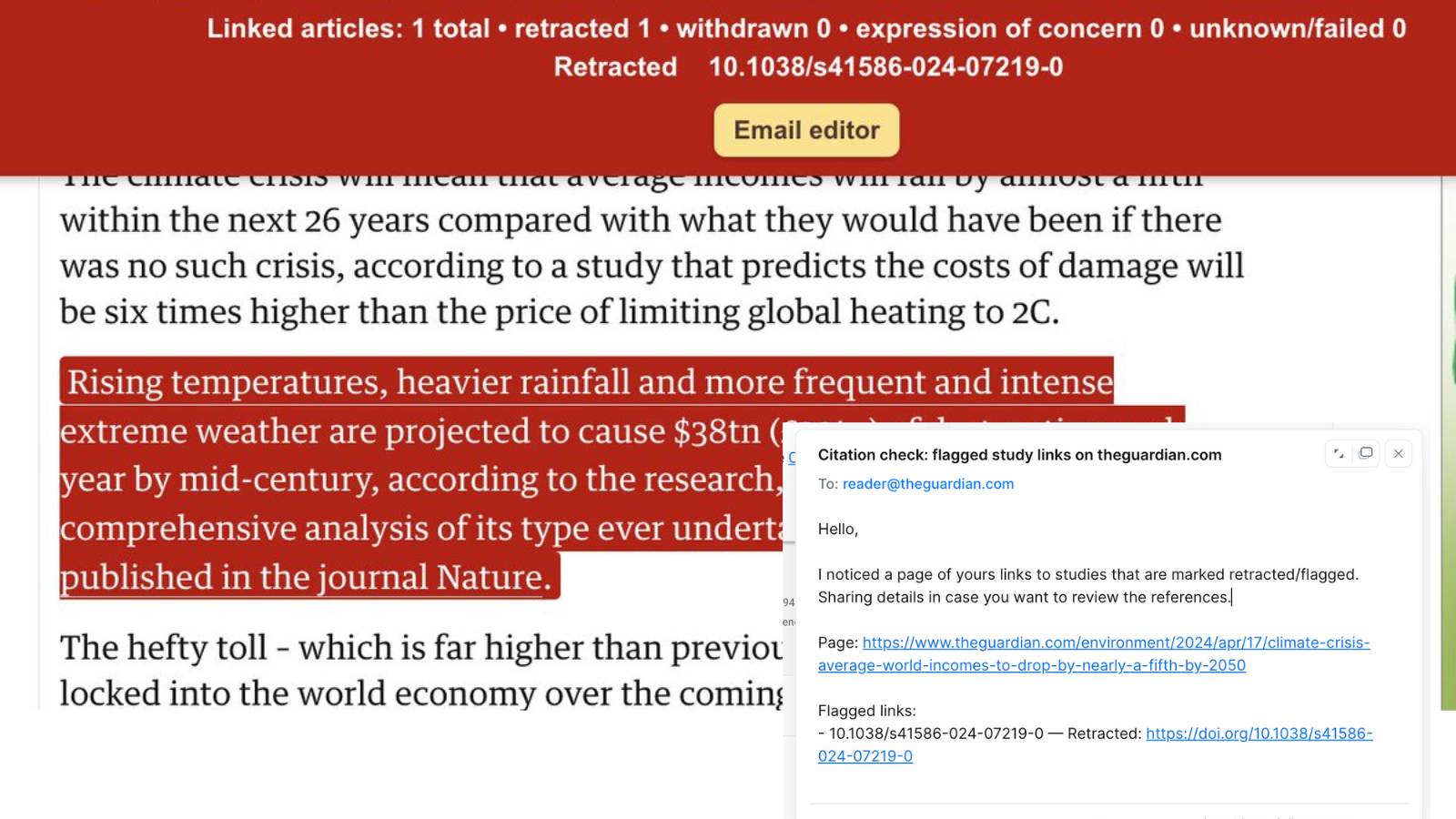 Earlier this month, Nature retracted the second-most-cited paper on climate change in 2024. The paper has already racked up 439 citations. It will probably collect even more, given that, according to a study on covid papers, 80% of papers citing retracted research were published after the retraction date. [1] This is a huge modern problem. Many news articles and scientific papers cite retracted research without knowing it's retracted. Even more readers read news articles and scientific papers without knowing they have been retracted. I have long thought this is inadmissible in 2025. We have the tech to perform automatic checks for retractions; we just lack the will. So, I took some of that will and took some time off for a little coding project, and I made a free Chrome Extension that automatically shows when a news article or paper cites retracted research. With one click, it even pre-drafts an email to the editorial team or the corresponding author! It only works on laptops or desktop computers, and only on Chrome browsers or related browsers (such as Brave). It only takes one click to install and doesn't collect any data. Simply, whenever it detects you're visiting a news website (such as CNN or the WSJ) or a scientific website (such as Nature or PubMed), it automatically scans the page for citations of scientific research, checks these citations against retraction databases, and alerts you if any flagged research is found (retractions or expressions of concern). It currently supports about 100 sites. It's not perfect, but it's much better than the alternative – no check whatsoever. If it finds retracted research, it even shows you a button that, with one click, pre-drafts an email to the editorial team or corresponding author, with which you can let them know about the issue. This is probably the most important feature of the Chrome Extension, for it finally produces a system with which we can fight the spread of retracted research. You can download the free Chrome extension here or find the source code here. Of course, it has many margins of improvement, so feel free to let me know if you have any suggestions. References:[1] “The Citation of Retracted COVID-19 Papers is Common and Rarely Critical,” G. Meyerowitz-Katz et al., 2022. Antifragile OrganizationsJust a reminder that registration for my 2026 Antifragile Organizations course is now open. Tweets & Quotes |